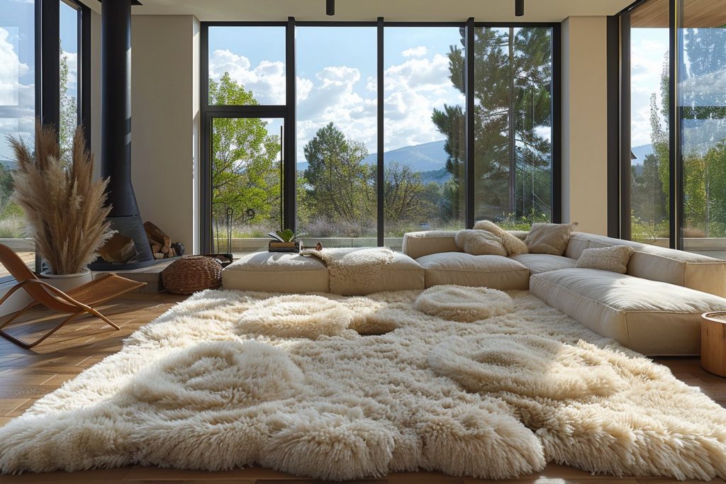 Dans un espace ouvert, définir des espaces distincts tout en maintenant une fluidité entre eux peut être un défi. Utiliser un tapis shaggy simplifie cette tâche. Placé stratégiquement, il peut délimiter visuellement différentes zones telles que le salon, le coin lecture ou encore la salle à manger. Cela crée une organisation claire sans cloisonner physiquement les lieux, préservant ainsi l’ouverture et la grandeur de l’espace.