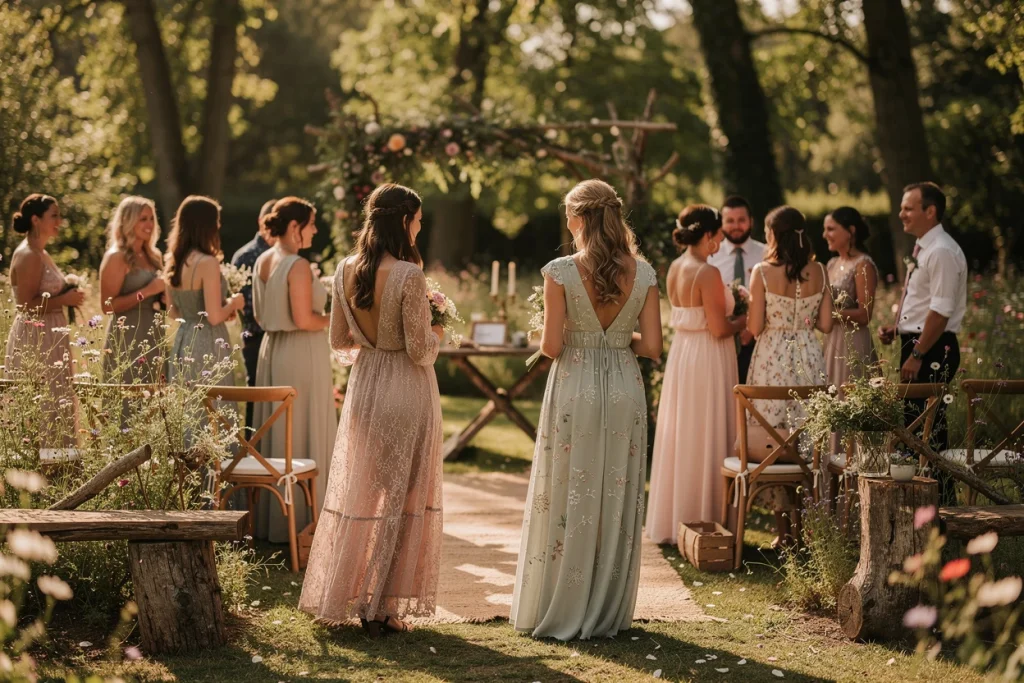 Un autre signe évident, c’est la présence de matières naturelles comme la dentelle légère ou le coton vaporeux. Les imprimés floraux et les broderies délicates apportent cette touche poétique typique des mariages champêtres. Le tout s’accorde avec des couleurs naturelles et pastels, renforçant l’idée d’une élégance simple, sans jamais voler la vedette.